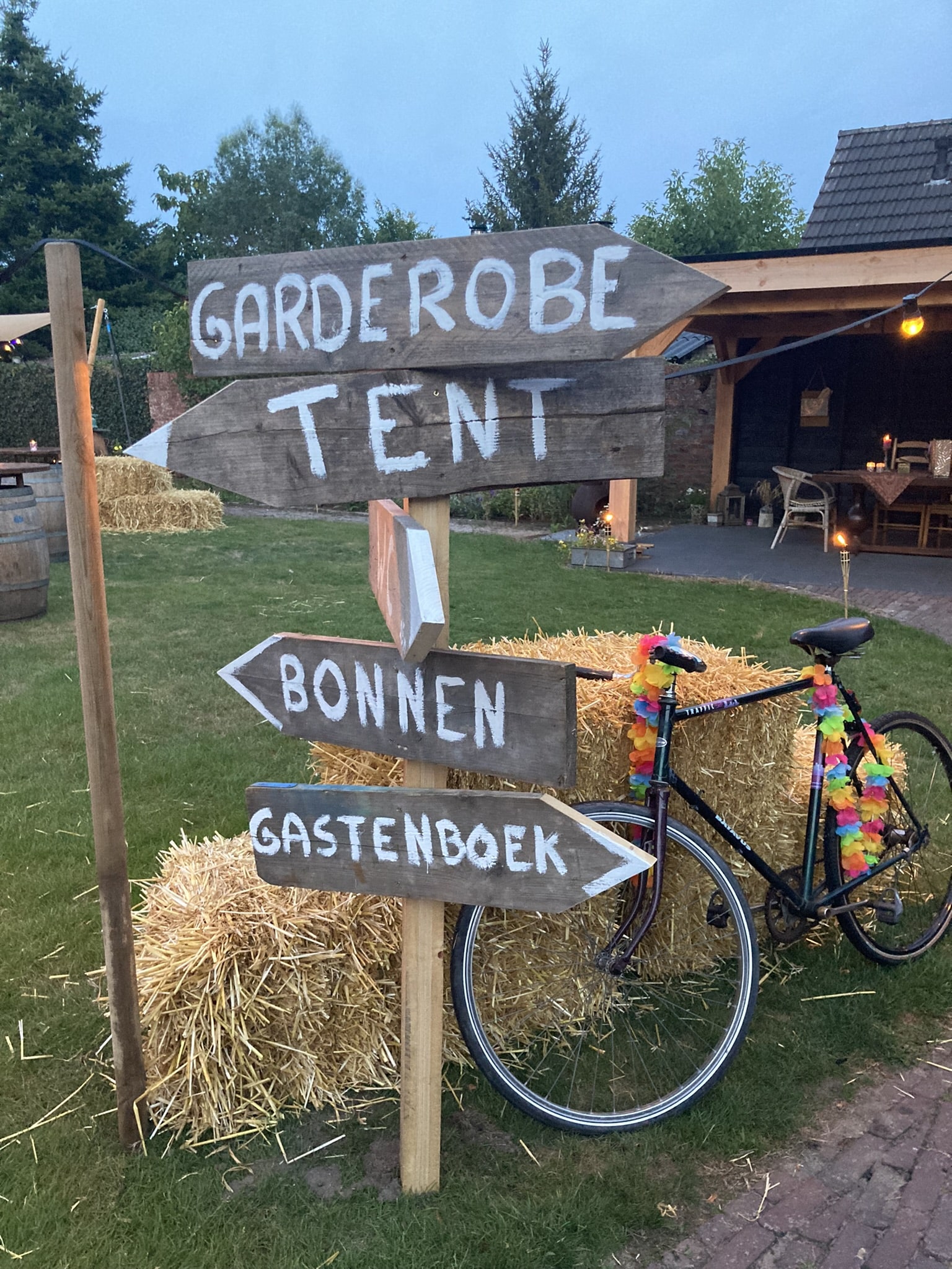 Voor de bruiloft hebben we gezorgd voor een prachtige stretchtent en meubilair waaronder een voorzetbar met kast, hangtafels met krukken en lage tafels met stoelen. Daarnaast hebben we de aankleding verzorgd waaronder de lampionnen in te tent, fakkels, verlichting en hooibalen. Door ons hardwerkend en gezellige team is iedereen voorzien van een hapje en een drankje en hebben we dit trouwfeest in eigen tuin met veel plezier mogen verzorgen.